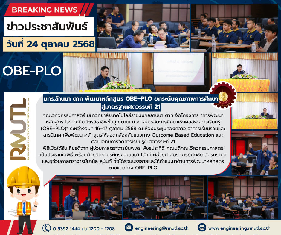 คณะวิศวกรรมศาสตร์ มหาวิทยาลัยเทคโนโลยีราชมงคลล้านนา ตาก จัดโครงการ “การพัฒนาหลักสูตรประกาศนียบัตรวิชาชีพชั้นสูง ตามแนวทางการจัดการศึกษาเชิงผลลัพธ์การเรียนรู้ (OBE – PLO)” ระหว่างวันที่ 16 – 17 ตุลาคม 2568 ณ ห้องประชุมทองกวาว อาคารเรียนรวมและสารนิเทศ เพื่อยกระดับคุณภาพหลักสูตรให้สอดคล้องกับมาตรฐานการศึกษาในศตวรรษที่ 21