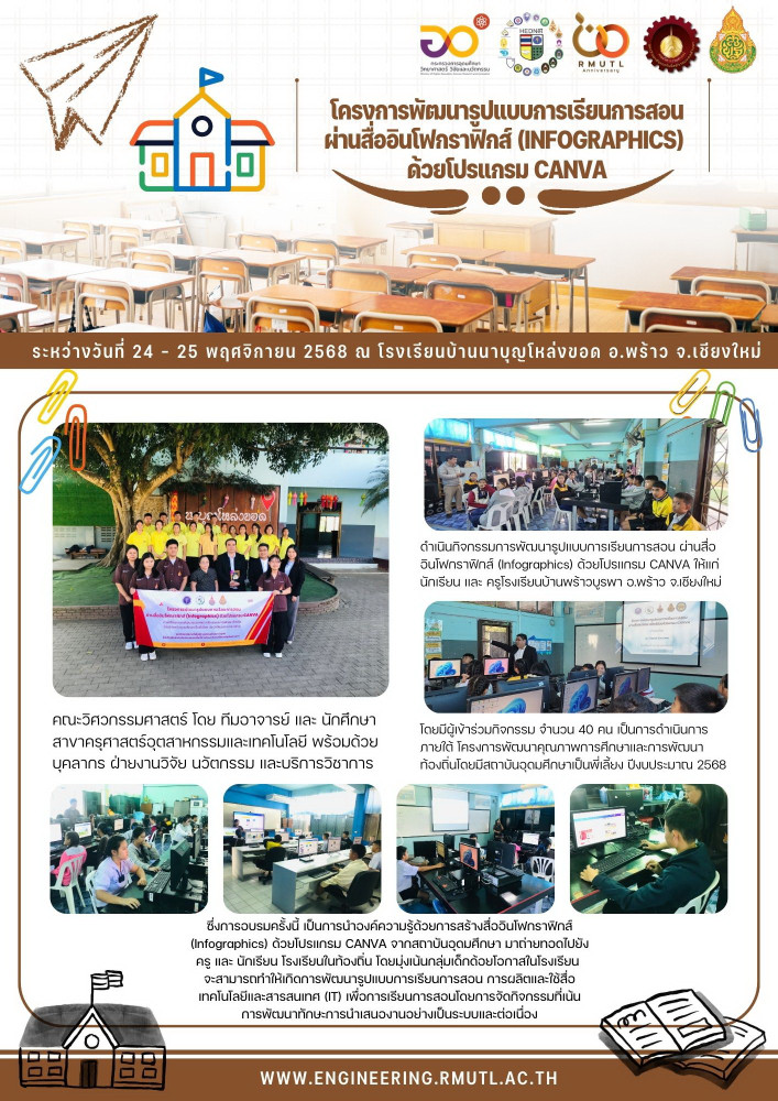 ระหว่างวันที่ 24 – 25 พฤศจิกายน 2568 คณะวิศวกรรมศาสตร์ มหาวิทยาลัยเทคโนโลยีราชมงคลล้านนา ได้จัด โครงการพัฒนารูปแบบการเรียนการสอนผ่านสื่ออินโฟกราฟิกส์ (Infographics) ด้วยโปรแกรม CANVA ณ โรงเรียนบ้านนาบุญโหล่งขอด อำเภอพร้าว จังหวัดเชียงใหม่
