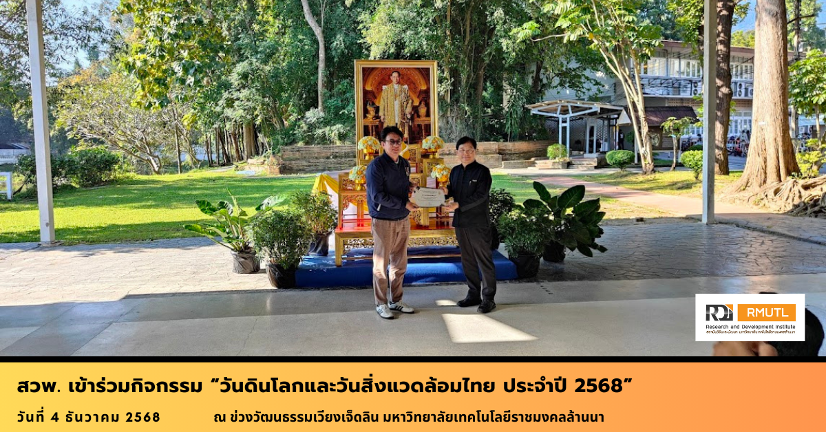 เมื่อวันที่ 4 ธันวาคม 2568 ผู้ช่วยศาสตราจารย์ ดร.ธีระศักดิ์ สมศักดิ์ และบุคลากร สถาบันวิจัยและพัฒนา เข้าร่วมกิจกรรม วันดินโลกและวันสิ่งแวดล้อมไทย ประจำปี 2568 โดยมี รองศาสตราจารย์ ดร.ประชา ยืนยงกุล รองอธิการบดีฝ่ายวิชาการและกิจการนักศึกษา เป็นประธานกล่าวเปิดงานและ พันจ่าเอกอำนาจ ใจคำฟู ผู้อำนวยการกองกลางกล่าวรายงานวัตถุประสงค์การจัดงาน ณ ข่วงวัฒนธรรมเวียงเจ็ดลิน มทร.ล้านนา พร้อมรับมอบใบประกาศนัยบัตรการเข้าร่วมกิจกรรมบำเพ็ญสาธารณประโยชน์ ของหน่วยงานใน มทร.ล้านนา ซึ่ง ภายในยังมีกิจกรรม นิทรรศการการสาธิตการบำรุงฟื้นฟูดินตามพระราชดำริจากสถาบันถ่ายทอดเทคโนโลยีสู่ชุมชน มทร.ล้านนา อีกด้วย