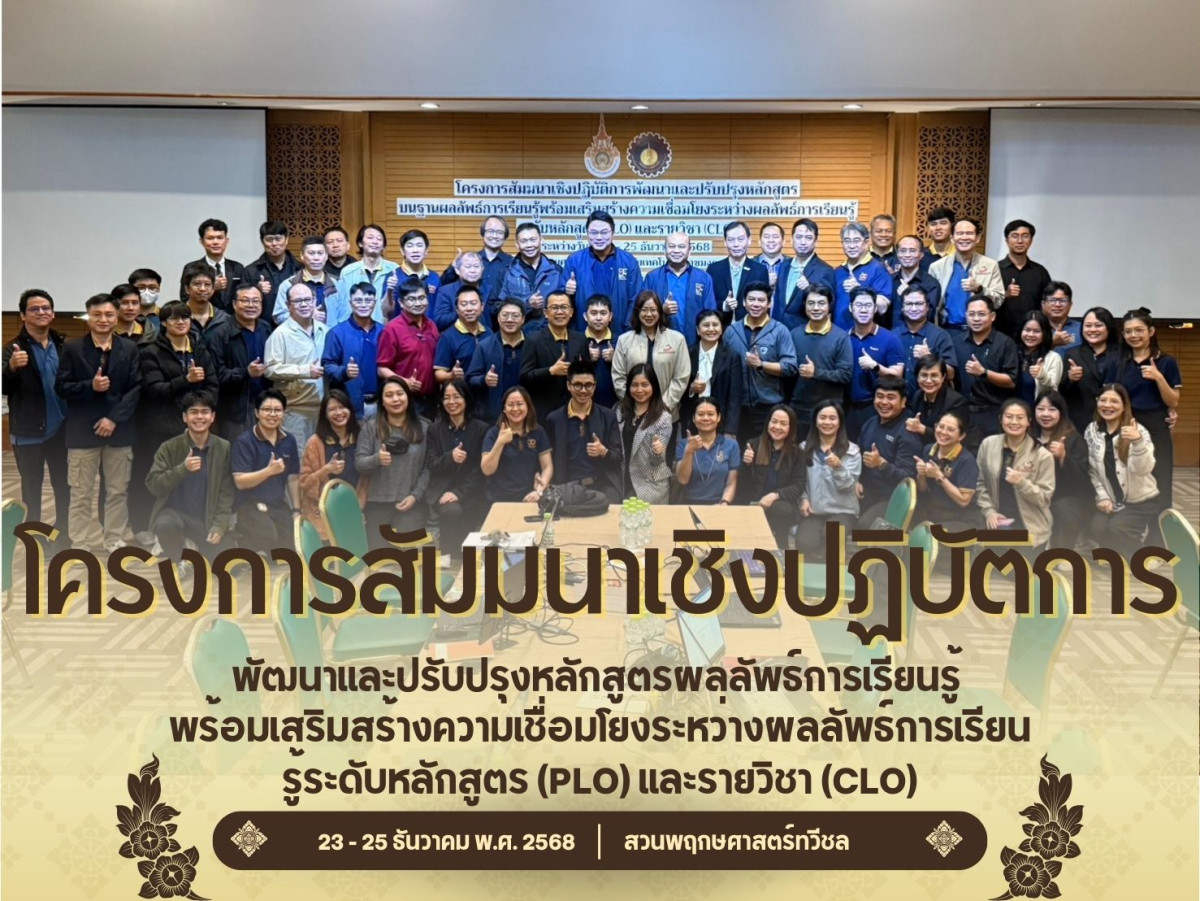 คณะวิศวกรรมศาสตร์ มหาวิทยาลัยเทคโนโลยีราชมงคลล้านนา จัดโครงการสัมมนาเชิงปฏิบัติการ เรื่อง “การพัฒนาและปรับปรุงหลักสูตรบนฐานผลลัพธ์การเรียนรู้ พร้อมเสริมสร้างความเชื่อมโยงระหว่างผลลัพธ์การเรียนรู้ระดับหลักสูตร (PLO) และรายวิชา (CLO)” ระหว่างวันที่ 23–25 ธันวาคม 2568 ณ โรงแรม Horizon Village & Resort Chiangmai (สวนพฤกษศาสตร์ทวีชล) อำเภอดอยสะเก็ด จังหวัดเชียงใหม่ เพื่อยกระดับคุณภาพหลักสูตรให้สอดคล้องกับมาตรฐานการศึกษาระดับอุดมศึกษาและแนวคิด Outcome-Based Education (OBE)