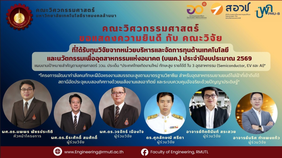คณะวิศวกรรมศาสตร์ มหาวิทยาลัยเทคโนโลยีราชมงคลล้านนา ขอแสดงความยินดีกับคณะวิจัยที่ได้รับทุนวิจัยจากหน่วยบริหารและจัดการทุนด้านการพัฒนาเทคโนโลยีและนวัตกรรมเพื่ออุตสาหกรรมแห่งอนาคต (บพค.) ประจำปีงบประมาณ 2569 ภายใต้แผนงานเป้าหมายสำคัญตามยุทธศาสตร์ ววน. ในประเด็น “ประเทศไทยก้าวหน้า ทักษะสูง รายได้ดี” โดยมุ่งเน้น 3 อุตสาหกรรมหลัก ได้แก่ Semiconductor, EV และ AI