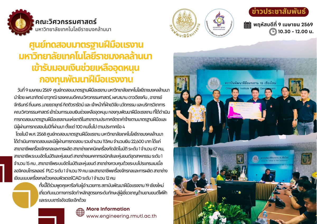 วันที่ 9 เมษายน 2569 ศูนย์ทดสอบมาตรฐานฝีมือแรงาน มหาวิทยาลัยเทคโนโลยีราชมงคลล้านนา นำโดย ผศ.อาทิตย์ ยาวุฑฒิ รองคณบดีคณะวิศวกรรมศาสตร์, ผศ.สมาน ดาวเวียงกัน , อาจารย์ จักรินทร์ ถิ่นนคร ,นายธรายุทธ์ กิตติวรารัตน์ และ เจ้าหน้าที่ฝ่ายวิจัย นวัตกรรม และบริการวิชาการ คณะวิศวกรรมศาสตร์ เข้าร่วมการมอบเงินช่วยเหลืออุดหนุน กองทุนพัฒนาฝีมือแรงงาน ที่ได้ดำเนินการทดสอบมาตรฐานฝีมือแรงงานแห่งชาติในสาขาตามประกาศอัตราค่าจ้างตามมาตรฐานฝีมือ และมีผู้ผ่านการทดสอบในปีที่ผ่านมา ตั้งแต่ 100 คนขึ้นไป ตามประกาศข้อ 4